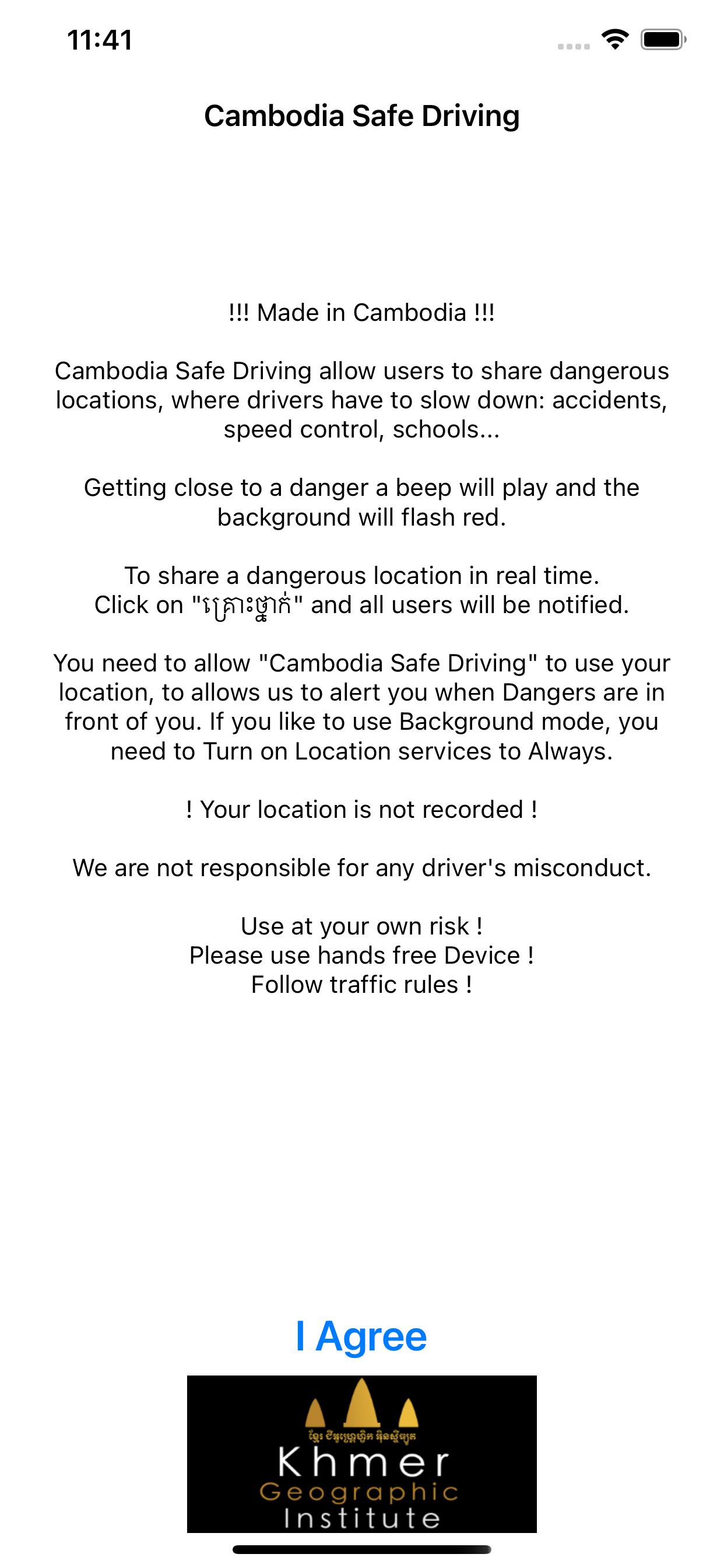 Download and install the Cambodia Safe Driving App from your App Store, accept the agreements, then start driving safely. If you see a Danger, click on the Danger (គ្រោះថ្នាក់) button.