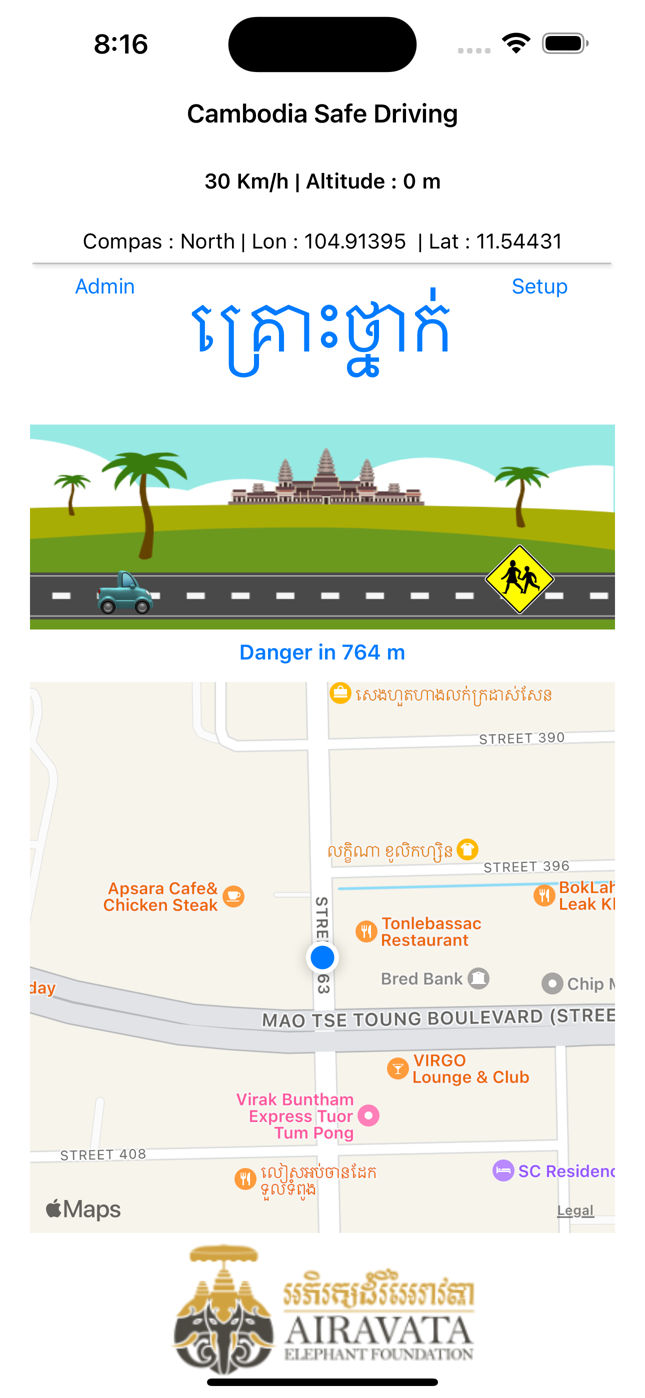 Download and install the Cambodia Safe Driving App from your App Store, accept the agreements, then start driving safely. If you see a Danger, click on the Danger (គ្រោះថ្នាក់) button.